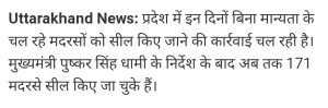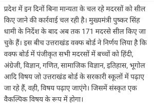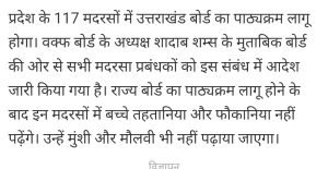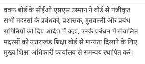 उत्तराखंड में 117 वक़्फ बोर्ड बिना मान्यता के थे अब उतराखंड बोर्ड की मान्यता से चलेगा मदरसा।