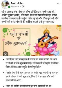 एम्बेसडर डाॅ. अमित कुमार (जाॅन) ने देशवासियों और उत्तराखंड प्रदेश के सभी लोगों को बसंत पंचमी की हार्दिक बधाई एवं शुभकामनाएं दी।