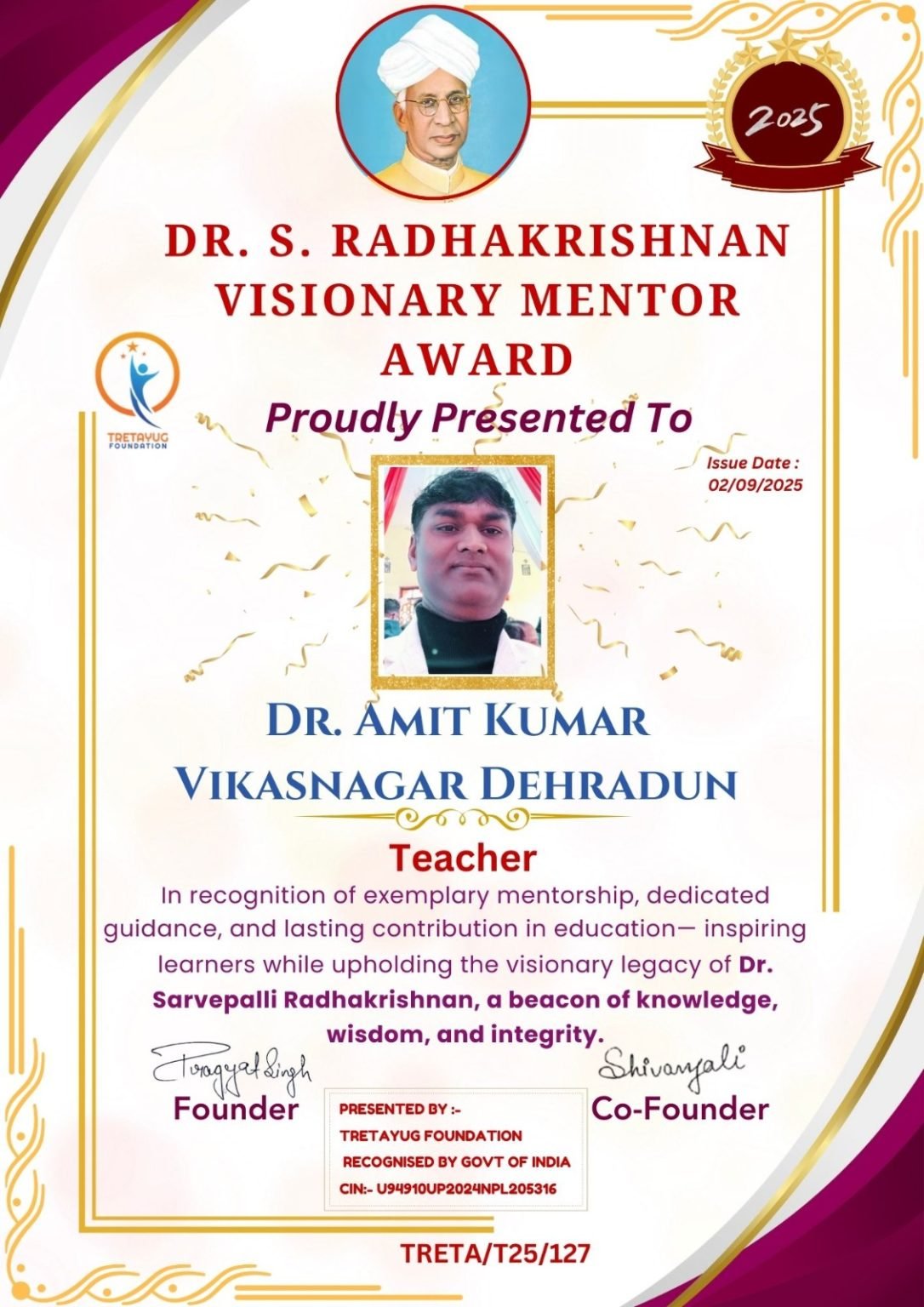 डॉ. अमित कुमार (जाॅन) को डॉ. सर्वपल्ली राधा कृष्ण नन विशनरी मैंटोर अवार्ड से शिक्षा दिवस के अवसर पर सम्मानित किया गया, शिक्षा के क्षेत्र में अमूल्य योगदान और सेवा के लिए साथ ही साथ मार्गदर्शक बनने के लिए इस सम्मान से उन्हें सम्मानित किया गया, डॉ. साहब का जीवन शिक्षा के क्षेत्र में निरन्तर अग्रसर है साथ ही साथ वह अपनी शिक्षा द्धारा सभी युवाओं का मार्गदर्शन करते रहते हैं बहुत लोगों का जीवन उन्के मार्ग दर्शन से बदला है समाज में शिक्षा के क्षेत्र में उनका अमूल्य योगदान है, और वह स्कूल से लेकर यूनिवर्सिटी तक काम करते हैं जिससे युवाओं को बहुत फायदा पहुंचे और सभ्य समाज और उस समाज में सभी अपनी शिक्षा का महत्वपूर्ण योगदान दे सके इसलिए कार्यरत हैं। राधा कृष्णनन और संत मोनफोट के पद चिन्हों पर चलकर उन्होंने मोनफोट ब्रदर्स का नाम रोशन किया है।