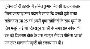 देहरादून में एक डम्मपर ने एक स्कूटी चालक को टक्कर मारी और बेटी को घसीटते हुए ले गया।AuthorPosted byMontfortnewsindiaPublishedNovember 18, 20254:11 pmX (Twitter)FacebookLinkedInShare this postShare this postClose sharing boxदेहरादून में एक डम्मपर ने एक स्कूटी चालक को टक्कर मारी और बेटी को घसीटते हुए ले गया।X (Twitter)FacebookLinkedInTelegramPosted by Montfortnewsindia on November 18, 2025.