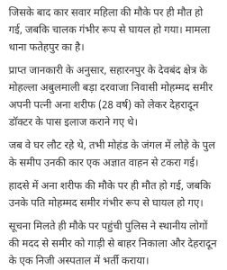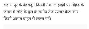 देहरादून से दवाई लेकर दम्पति लौटते वक्त मोहंड के जंगल के समीप हुआ एकसीडेंन्ट होने से मौत हो गई।AuthorPosted byMontfortnewsindiaPublishedFebruary 19, 202511:58 amX (Twitter)FacebookLinkedInShare this postShare this postClose sharing boxदेहरादून से दवाई लेकर दम्पति लौटते वक्त मोहंड के जंगल के समीप हुआ एकसीडेंन्ट होने से मौत हो गई।X (Twitter)FacebookLinkedInTelegramPosted by Montfortnewsindia on February 19, 2025.
