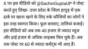 फौजियों का हापुड़ के ढाबे पर लोगों ने जबरदस्त स्वागत किया। विडियो वायरल।AuthorPosted byMontfortnewsindiaPublishedMay 12, 20256:51 pmX (Twitter)FacebookLinkedInShare this postShare this postClose sharing boxफौजियों का हापुड़ के ढाबे पर लोगों ने जबरदस्त स्वागत किया। विडियो वायरल।X (Twitter)FacebookLinkedInTelegramPosted by Montfortnewsindia on May 12, 2025.