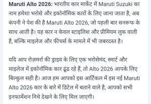 मारूति की आल्टो के नए लुक के साथ ही साथ सन रूफ ने मचाया कोहराम।AuthorPosted byMontfortnewsindiaPublishedJanuary 3, 20267:30 pmX (Twitter)FacebookLinkedInShare this postShare this postClose sharing boxमारूति की आल्टो के नए लुक के साथ ही साथ सन रूफ ने मचाया कोहराम।X (Twitter)FacebookLinkedInTelegramPosted by Montfortnewsindia on January 3, 2026.