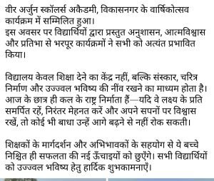 वीर अर्जुन स्कालर्स एकाडमी विकासनगर देहरादून में वार्षिकोत्सव में सम्मिलित होकर अपने आशीष वचनों में बताया, वहीं प्रबंधक प्रभात जी ने एम एल विकास नगर का भव्य स्वागत किया।