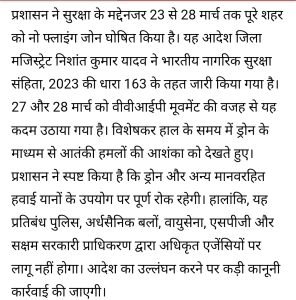 सरकार ने नो फलाइंग जोन घोषित किया।AuthorPosted byMontfortnewsindiaPublishedMarch 24, 20267:22 pmX (Twitter)FacebookLinkedInShare this postShare this postClose sharing boxसरकार ने नो फलाइंग जोन घोषित किया।X (Twitter)FacebookLinkedInTelegramPosted by Montfortnewsindia on March 24, 2026.